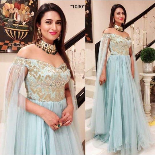 FABRIC DETAILS : Soft net with off shoulder sleeves with 7 metres flare along with...