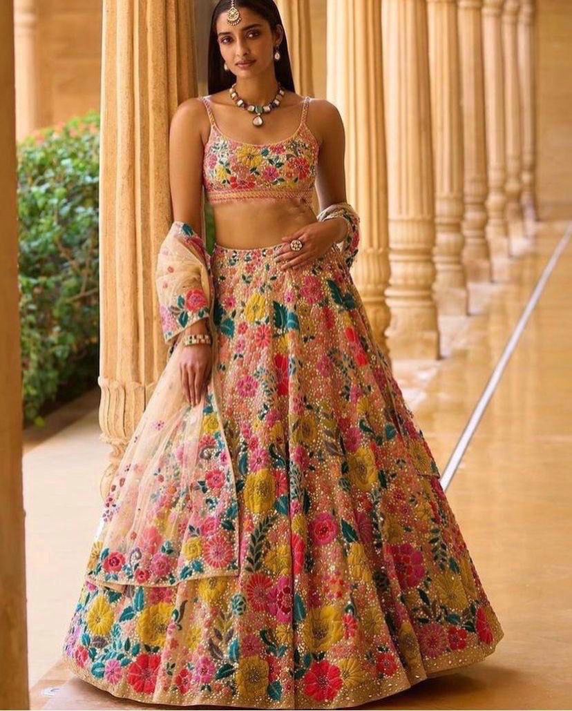 The lehenga features intricate detailing and is adorned with delicate glistening embellishments that catch the...