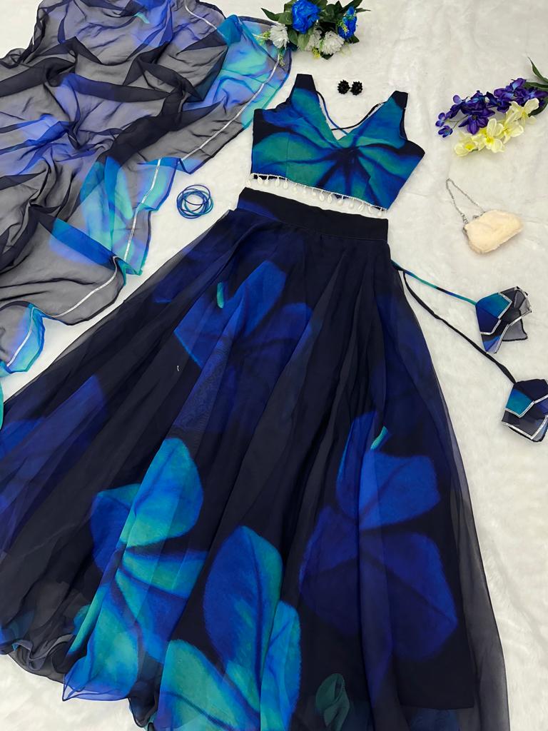 Navy Blue Color Digital Print Organza Lehenga Choli