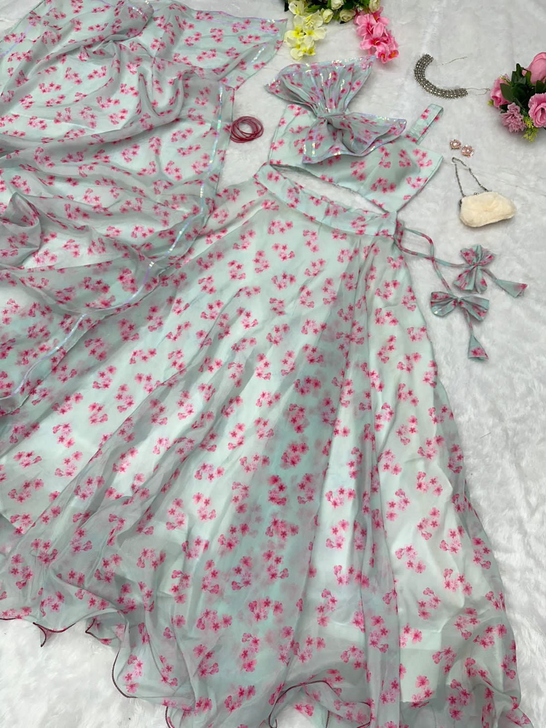 Organza Silk Digital Print Green Lehenga Fancy Blouse