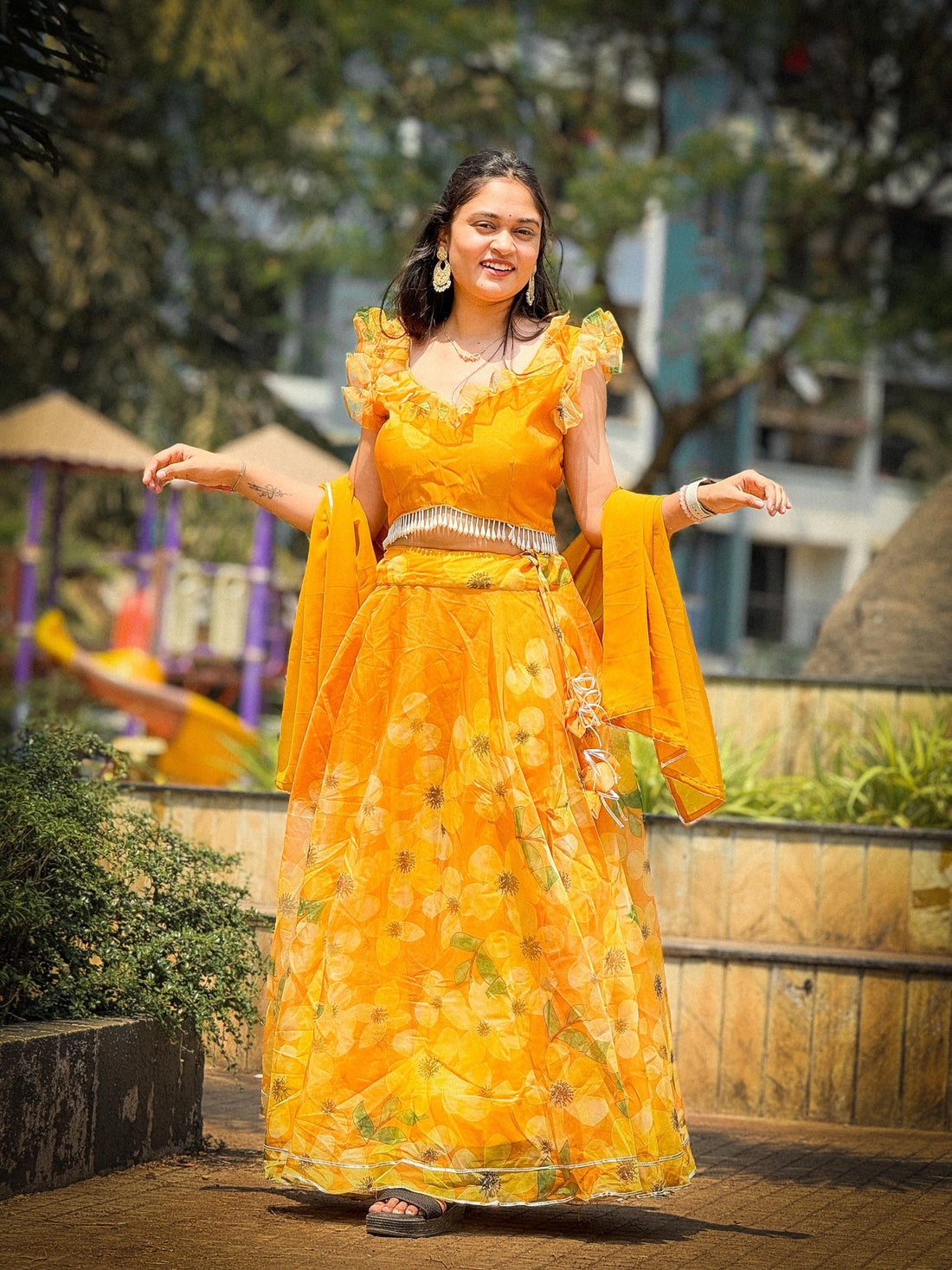 Yellow Organza Silk Flower Printed Lehenga Choli
