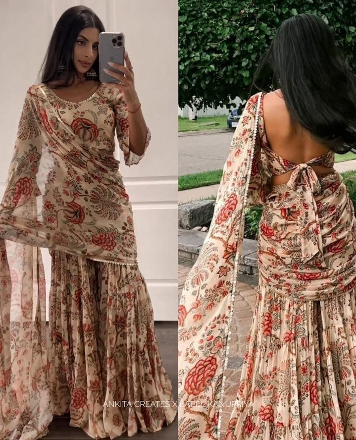 Step into the spotlight with our Digital Print Sharara Saree, a fusion of tradition and...