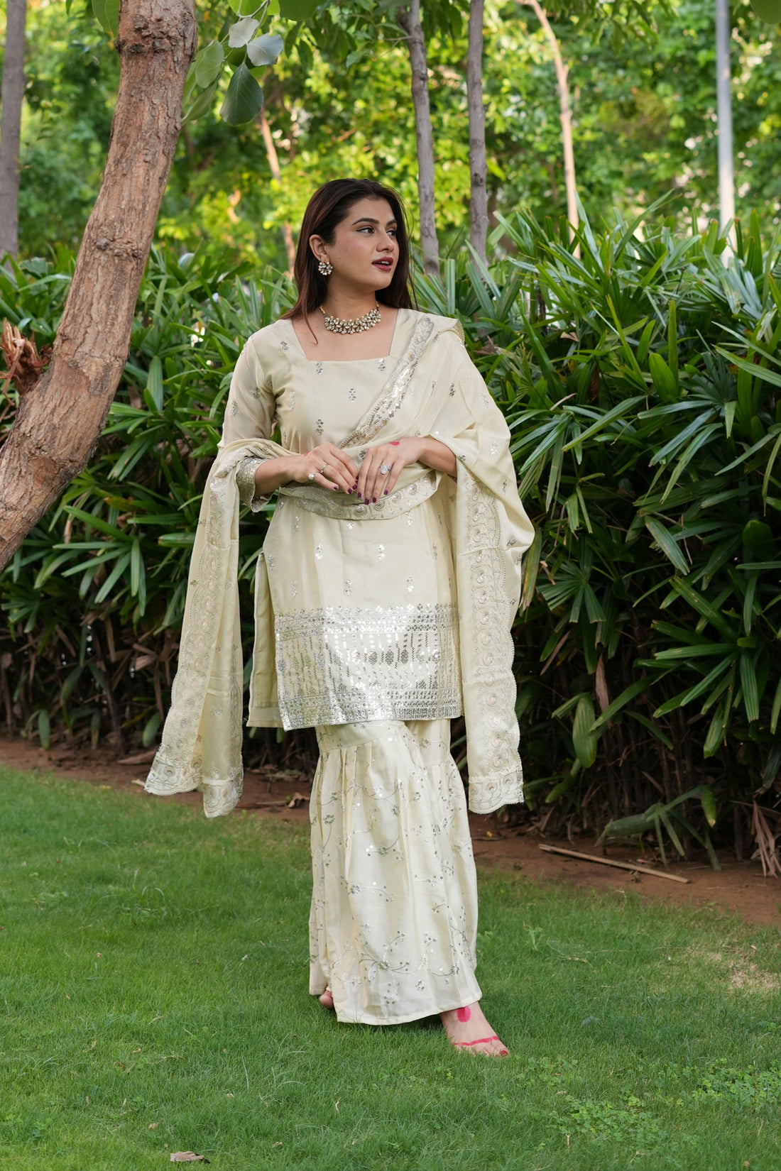 Expertly crafted from luxurious Chinon Silk, this off-white Kurti Gharara Set by Chakrika is a...