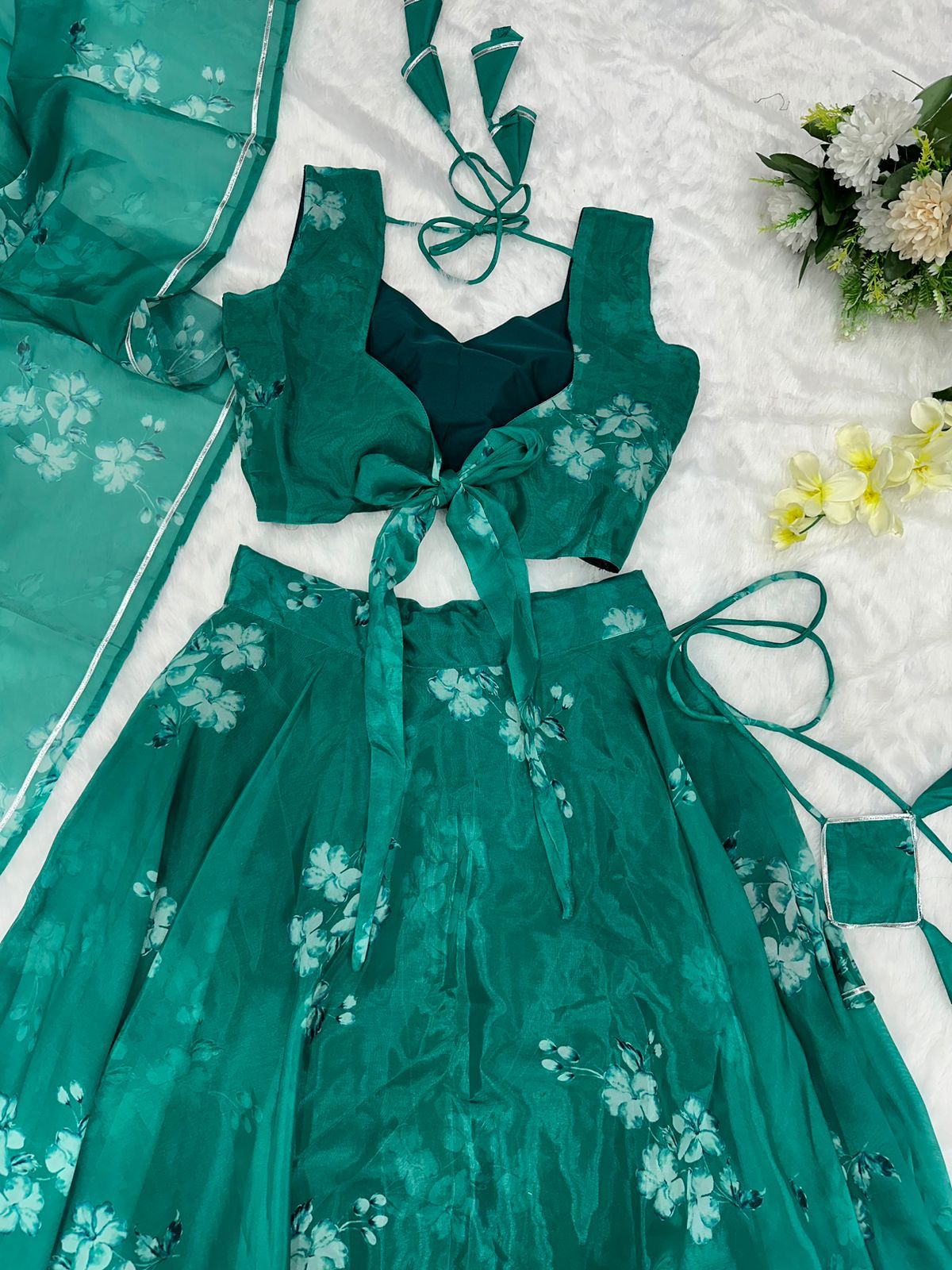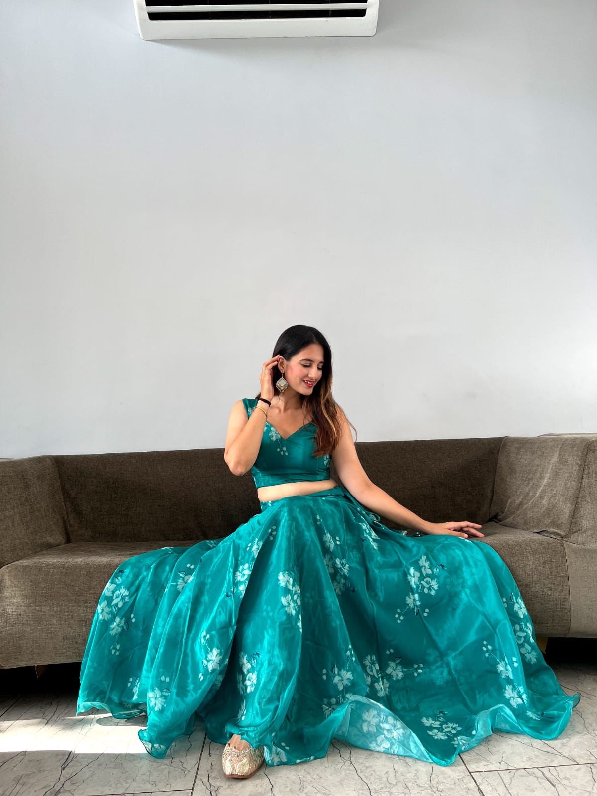Amazing Digital Print Aqua Green Organza Silk Lehenga Choli