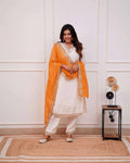 This suit set features intricate original coding embroidery and sequins Satari work, paired with matching pants and a beautifully decorated dupatta.