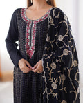 Elegant and timeless, this Black Color Chinon Silk Three Piece Kurti Suit features a beautifully crafted kurti, matching bottoms, and a stylish dupatta, perfect for festive events and special occasions. Soft silk fabric ensures a rich look with a comfortable feel.
