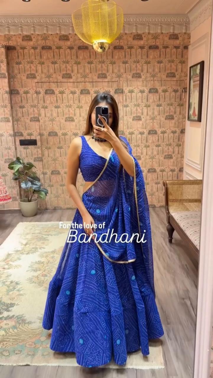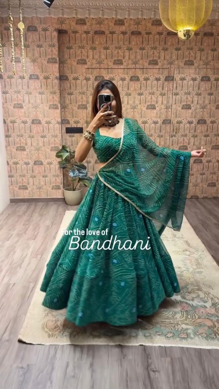 SIZE : Fully stitched, 5 Meters full-flair lehenga (Free Size)