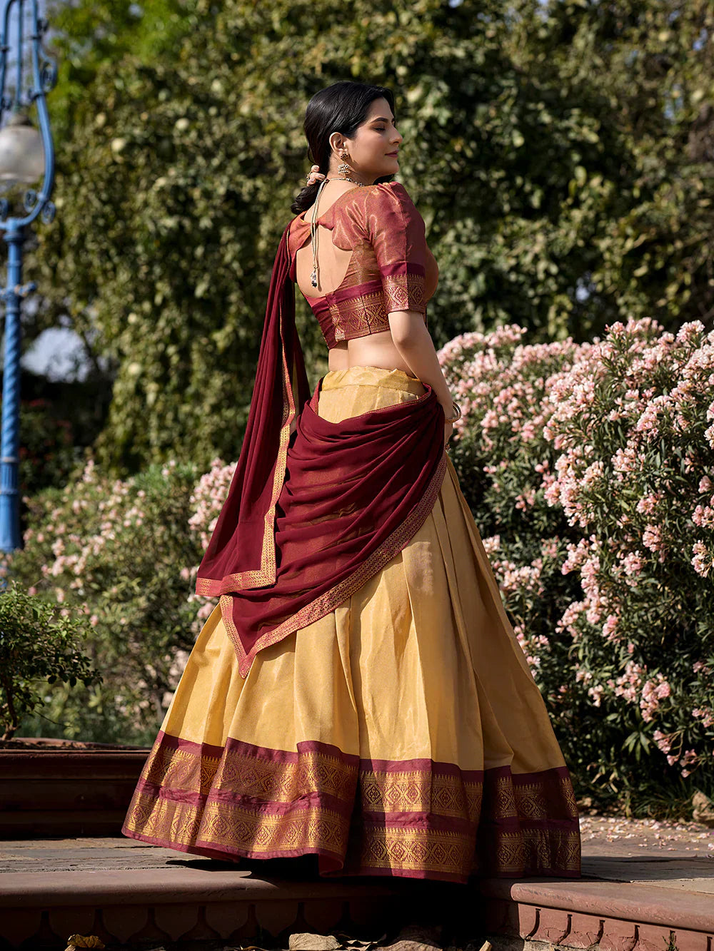 - Paired with similar kanchipuram zari weaving work dupatta and choli.