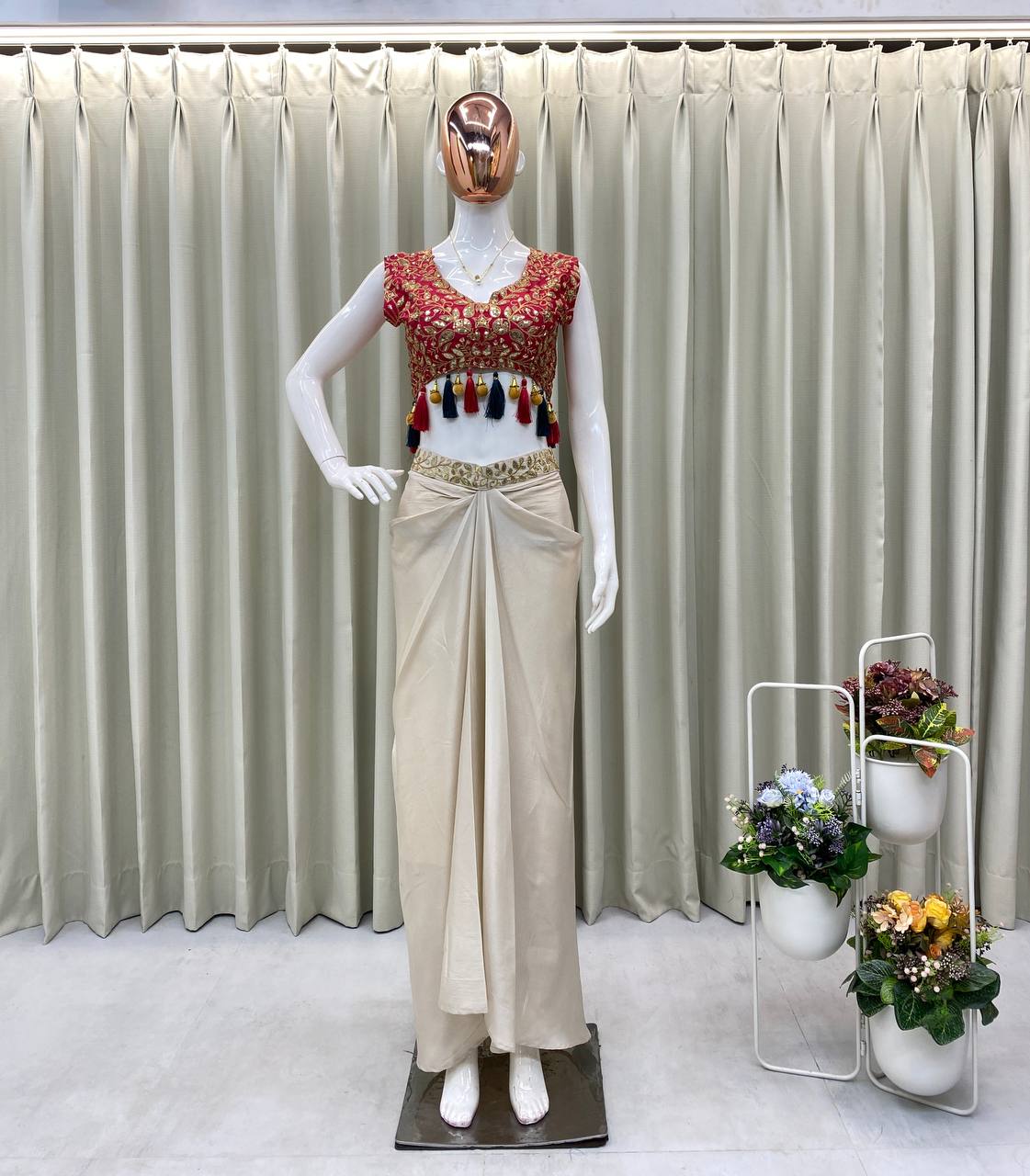 Cream Cowl Skirt Pink Blouse and Shrug With Embroidery Western Look Outfit