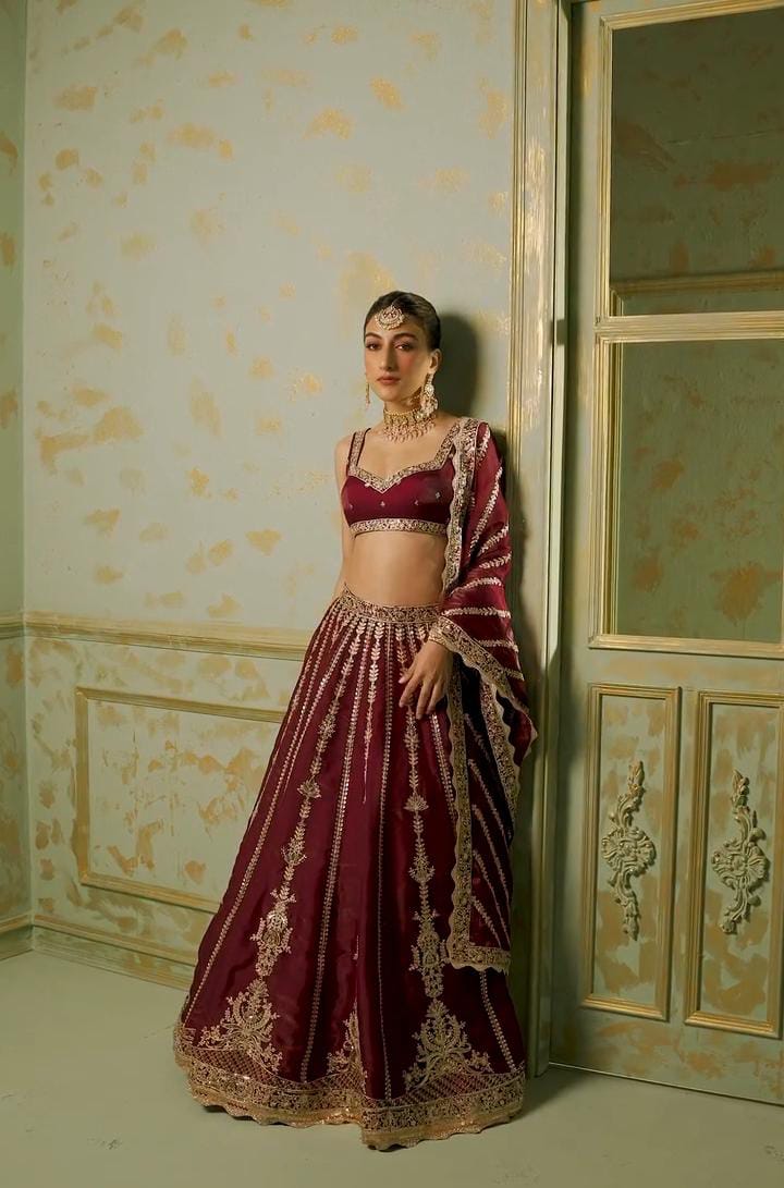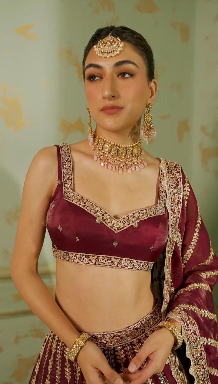 LEHENGA : Kasturi silk lehenga with sequins, dori and zari work.