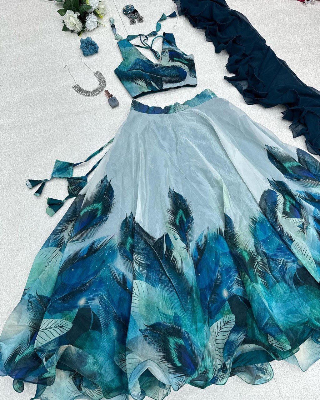 Designer Feather Print Sky Blue Color Organza Silk Lehenga Choli