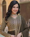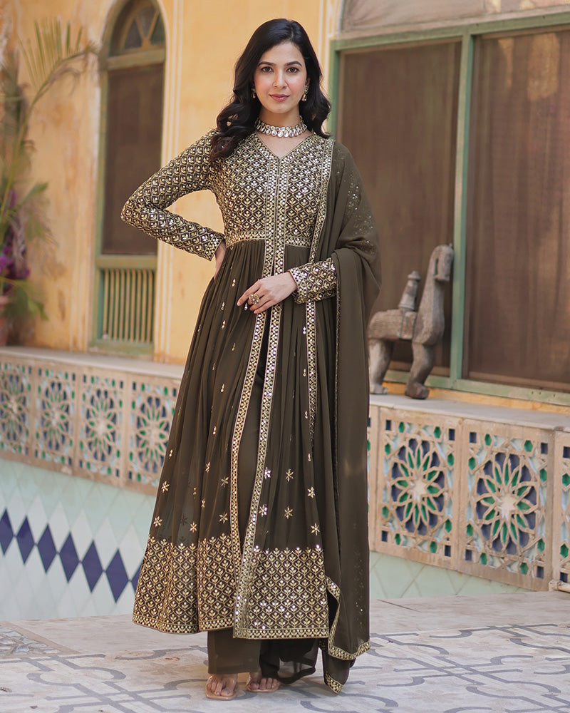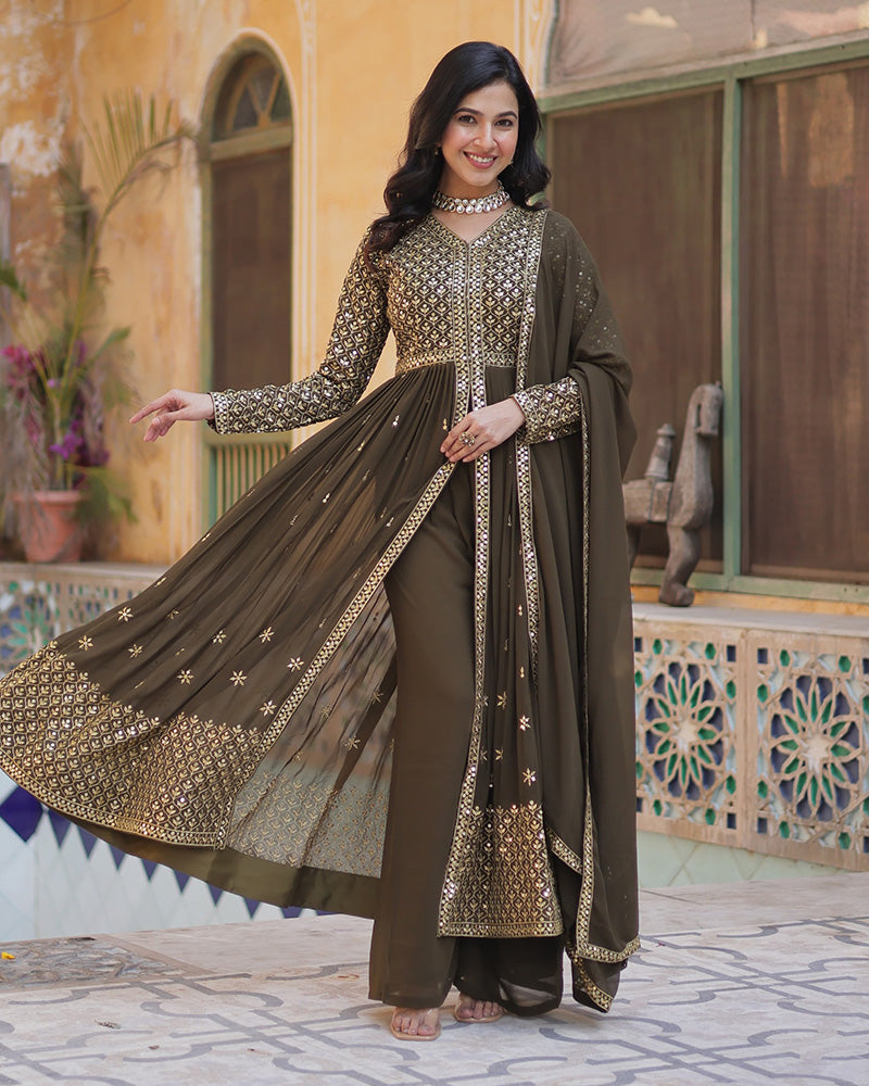 Elegant Designer Mehndi Color Three-Piece Sharara Suit featuring a beautifully embroidered kameez, flared sharara pants, and a matching dupatta. Perfect for festive occasions and weddings, exuding grace and sophistication.