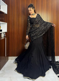 The set is completed with a beautiful dupatta, also made of soft georgette, and embellished with intricate heavy sequence work and pearls, which enhances the overall elegance of the outfit. The dupatta is attached seamlessly to the lehenga, offering a complete and cohesive look that is both traditional and trendy.