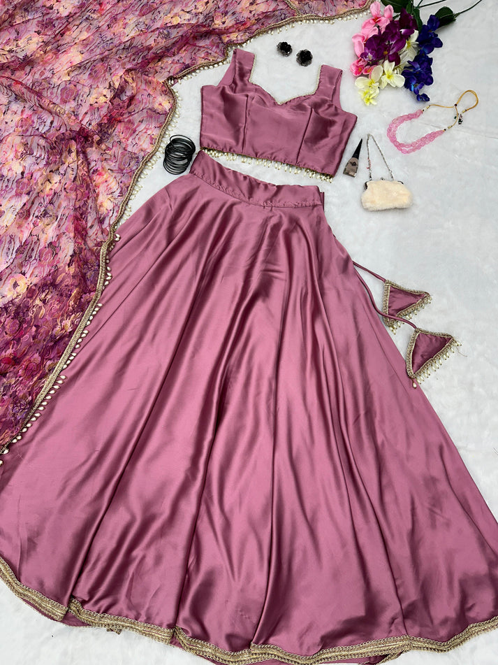 Fancy Satin Silk Dusty Pink Lehenga Choli With Net Dupatta