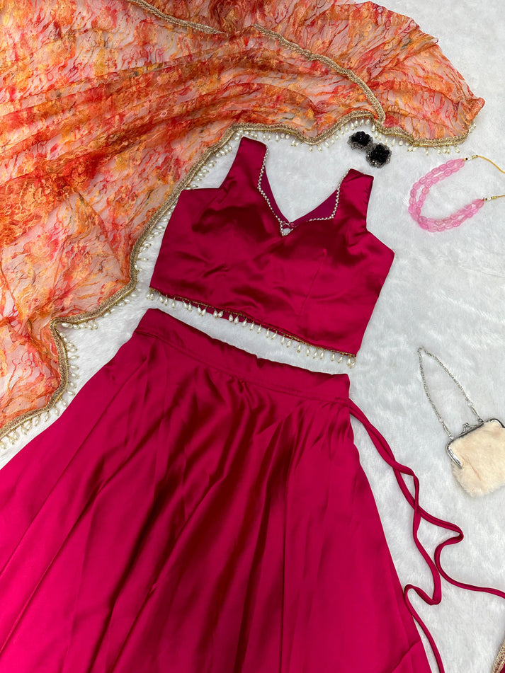 Fancy Satin Silk Pink Lehenga Choli With Net Dupatta