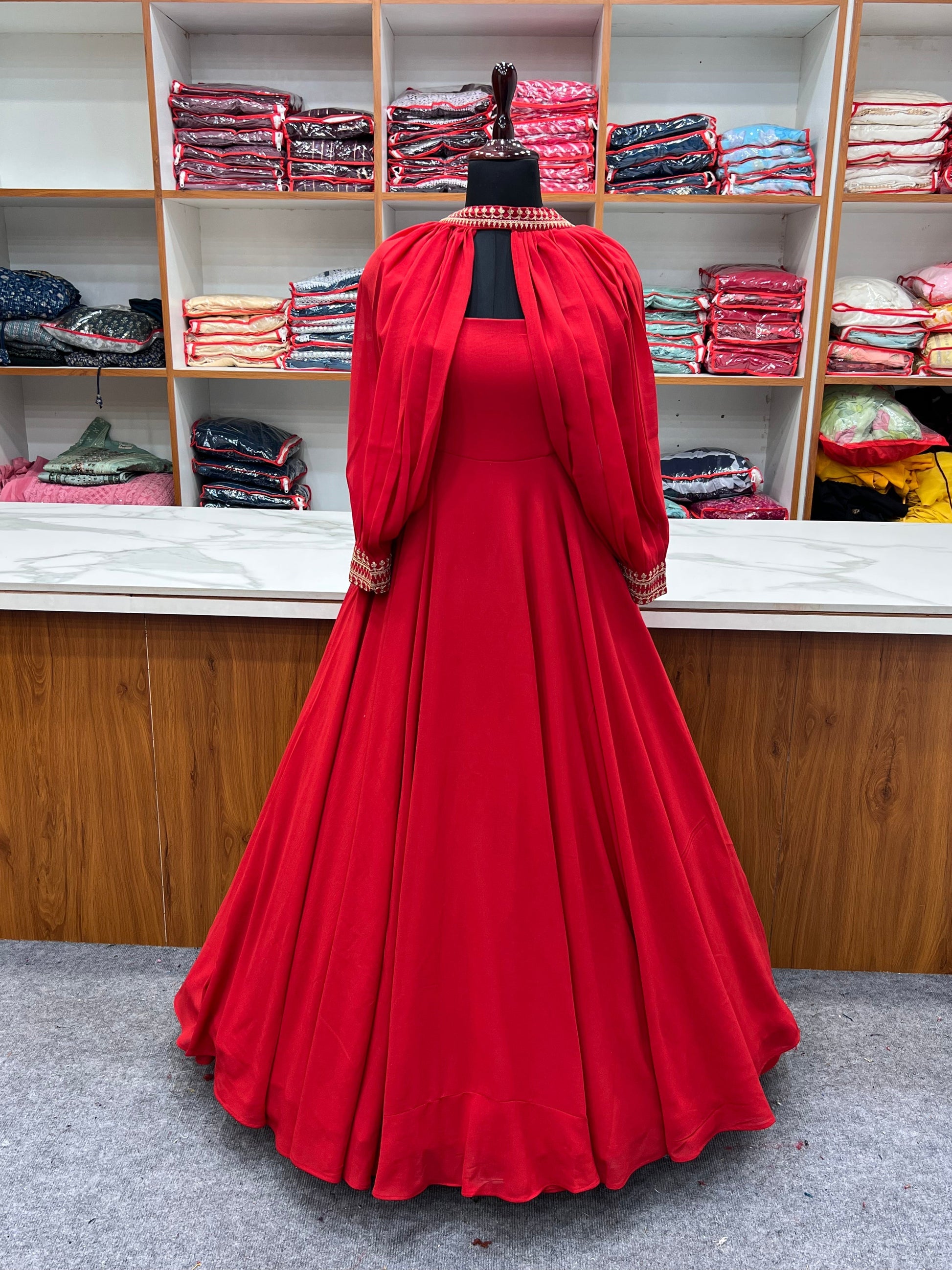 Crafted from luxurious georgette fabric, this gown effortlessly drapes to enhance your silhouette. The exquisite design, coupled with the latest fashion trends, makes it a must-have for any special occasion. Elevate your wardrobe with this chic and timeless piece that exudes both grace and modern flair, ensuring you turn heads wherever you go.