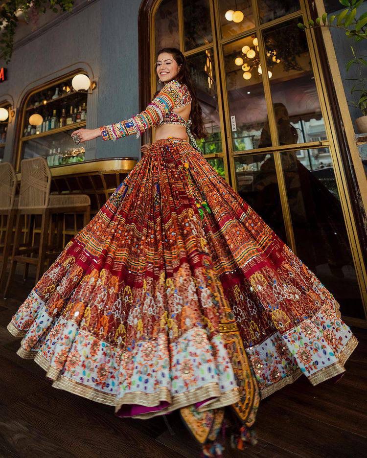 Experience the essence of tradition and elegance with our "Ghoomar Glamour Lehenga Choli". Crafted with intricate detailing and vibrant colors, this ensemble is inspired by the grace of Ghoomar dance, embodying the spirit of Navratri festivities. Adorned with traditional motifs and fine embroidery, the lehenga exudes timeless charm, while the choli adds a modern flair with its contemporary design. Whether you're twirling on the dance floor or attending festive celebrations, this ensemble promises to make you the epitome of style and grace.Â