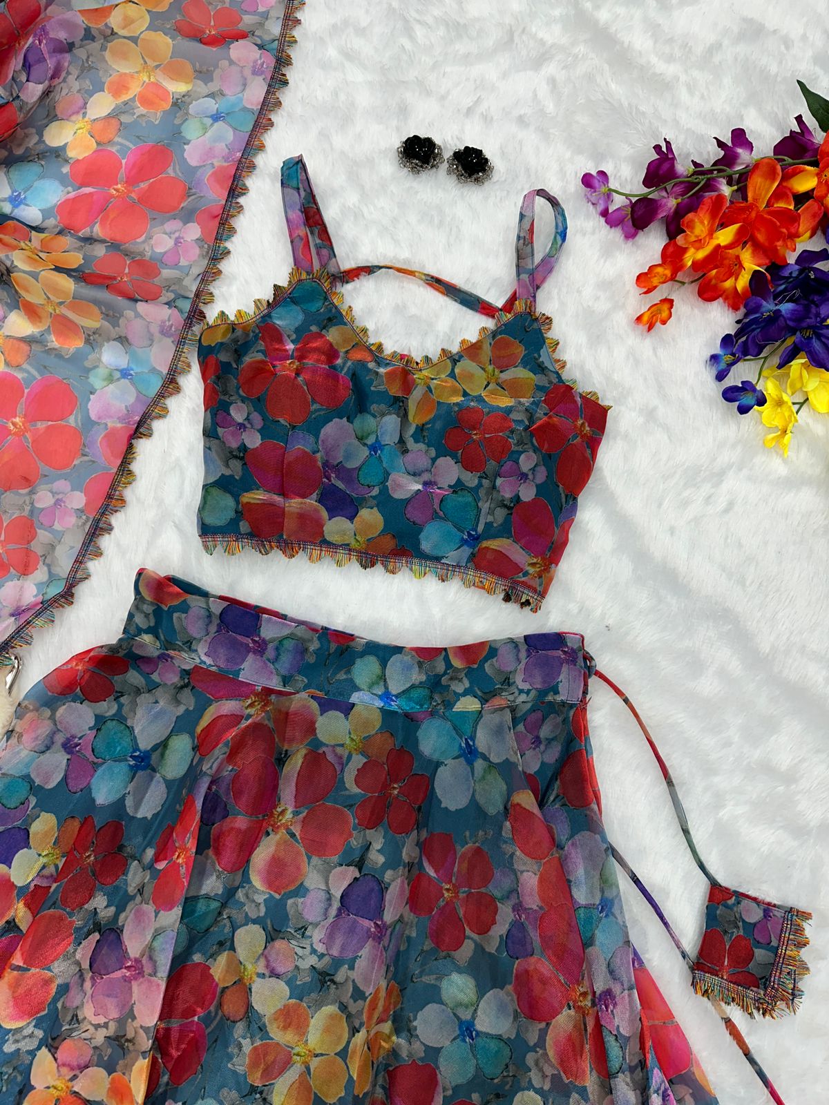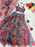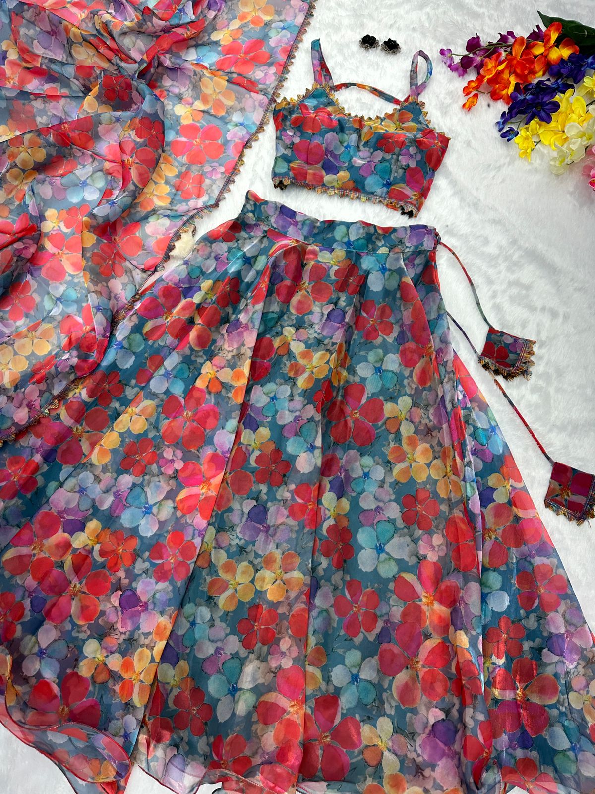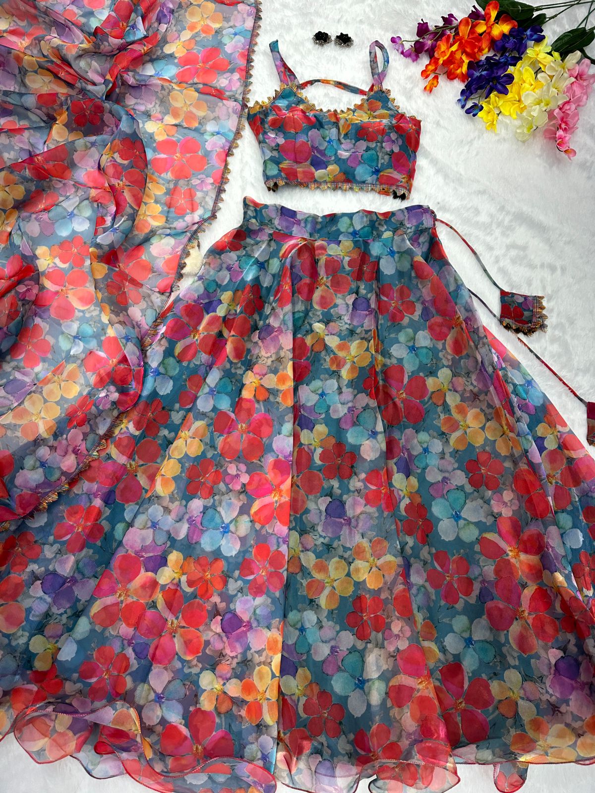 Glorious Multi Color Printed Organza Silk Lehenga Choli