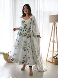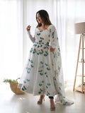 Step into a world of natural beauty with the Green Leaf Print White Colour Organza Three Piece Anarkali Suit. Embrace the enchanting allure of leaf motifs on a pristine white organza fabric, tailored to perfection in a three-piece ensemble, creating a captivating and refreshing look for your special occasions.