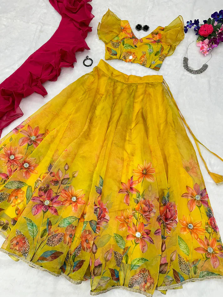 Work | Floral Printed Kali Lehnga With Real Mirror |