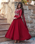 Elevate your ethnic style with this Maroon Faux Blooming Embroidered Gown with Dupatta. Designed with detailed embroidery on luxurious faux fabric, this gown offers a rich and graceful look, paired beautifully with a matching dupatta—perfect for festive occasions and special events.