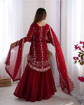 Gorgeous maroon faux georgette sharara suit featuring delicate embroidery and a flowy silhouette, paired with a matching dupatta—perfect for weddings, parties, and festive celebrations.