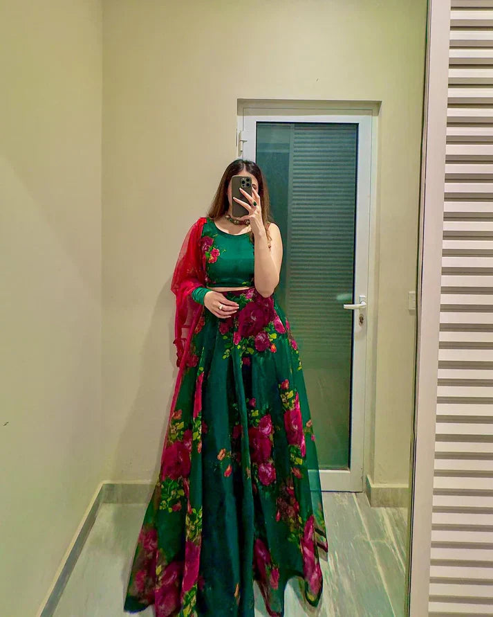 Multi Floral Print Green Color Organza Silk Lehenga Choli