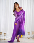 This multi purple georgette three-piece Anarkali suit features a rich blend of shades with a flowy, elegant silhouette. Paired with a matching dupatta and bottom, it’s perfect for festive events and special occasions, offering a vibrant and graceful look.