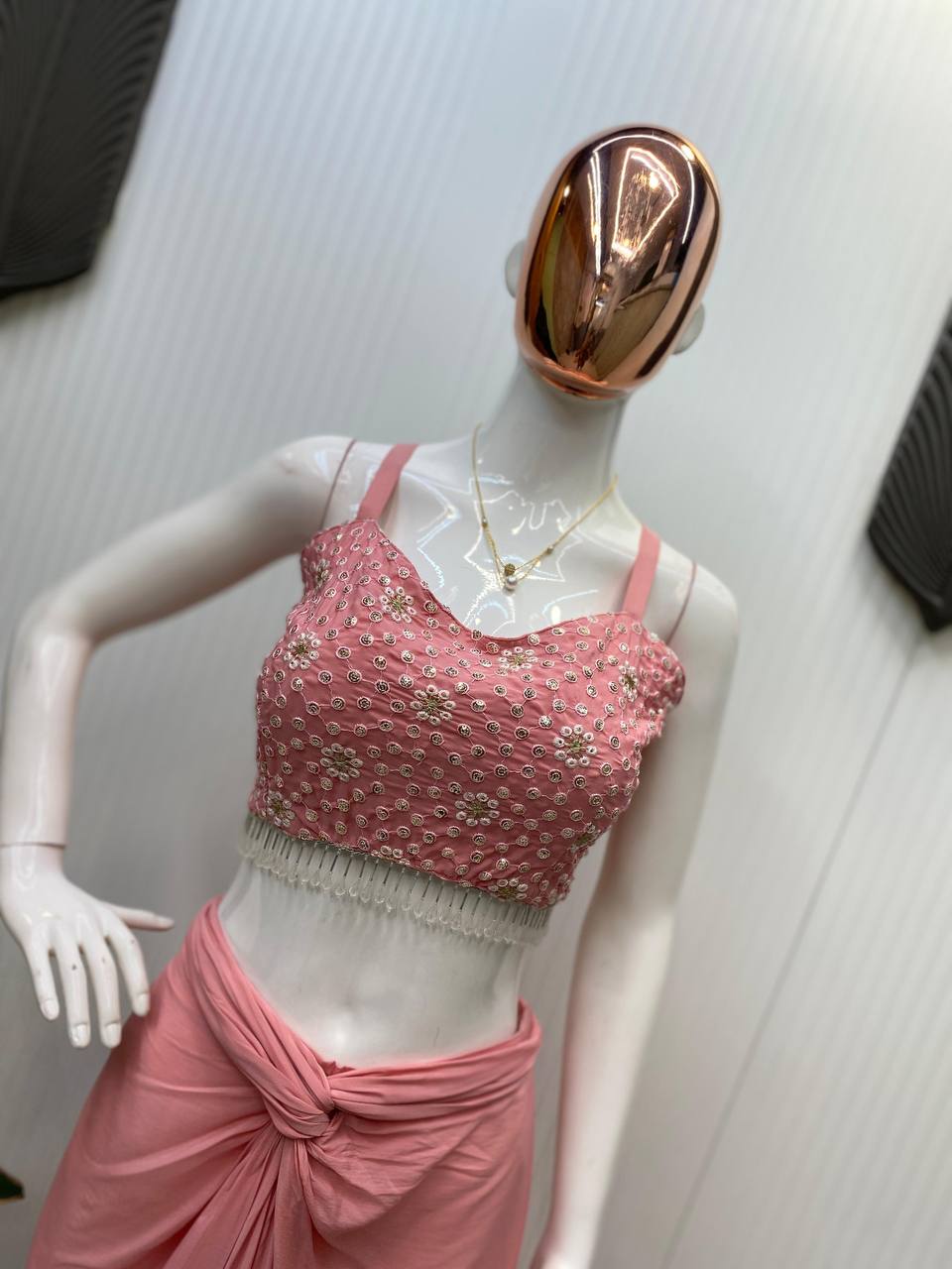 TUBE BLOUSE:FRENCH CRAPE WITH SEQUENCE EMBROIDERY AND SILVER MOTI LACE