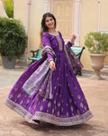 This purple-colored gown, made from luxurious chinnon fabric, features beautiful sequin embroidery that adds a shimmering effect. Ideal for festive occasions and special events, this gown combines traditional elegance with a contemporary style for a captivating look.