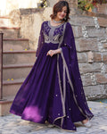 Make a graceful statement in this Purple Faux Blooming Embroidered Gown with Dupatta. Featuring intricate embroidery on rich faux fabric, the gown exudes elegance and charm. Paired with a matching dupatta, it's perfect for festive occasions, weddings, or evening events.