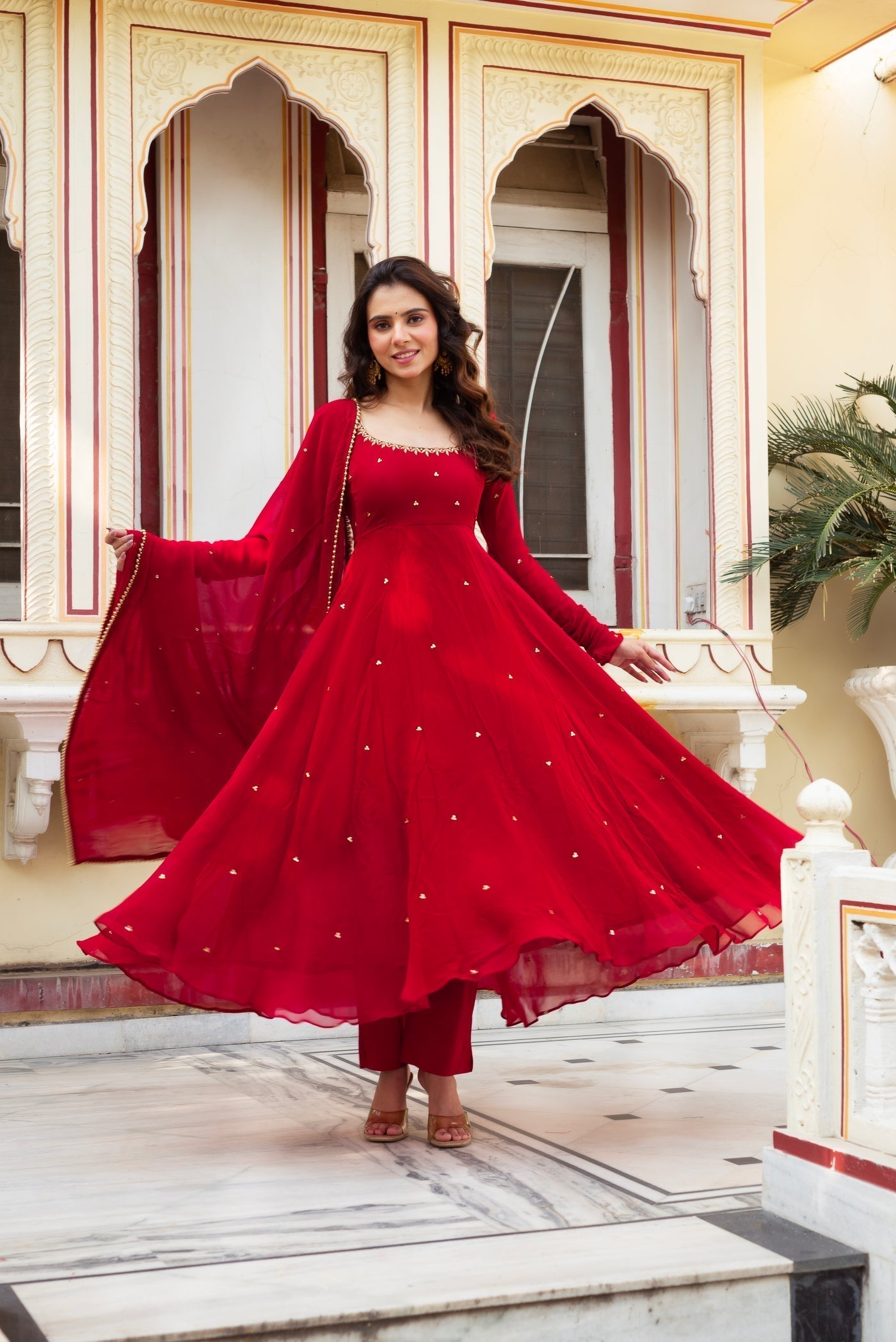 Make a bold statement in this luxurious Red Hand Work Anarkali Suit – the epitome of grace and sophistication!