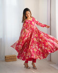 Add a touch of elegance with this Rani Pink Color Pure Soft Organza Three-Piece Anarkali Suit. Featuring a flowy silhouette and delicate texture, it comes with a matching bottom and dupatta—perfect for festive occasions and graceful gatherings.