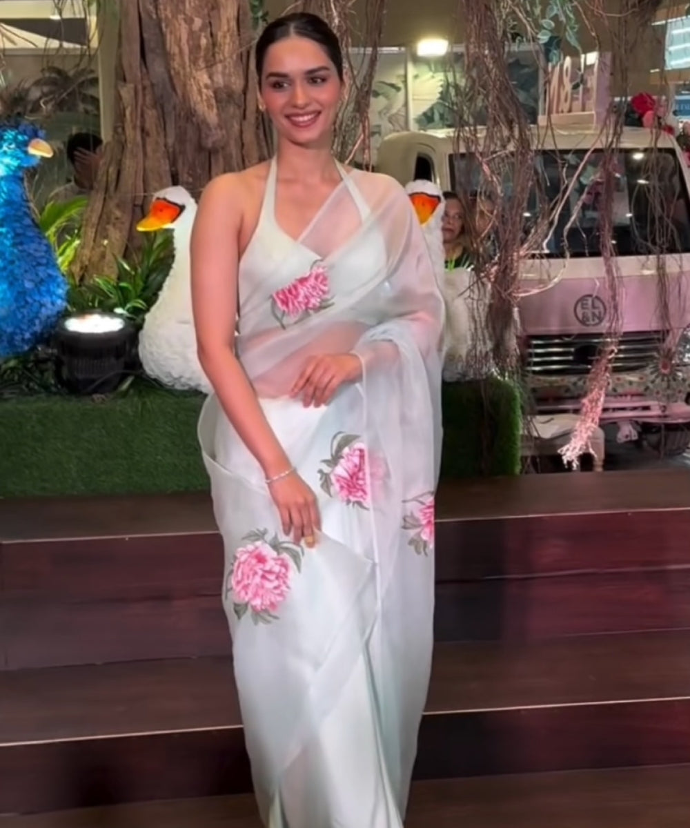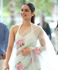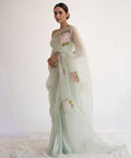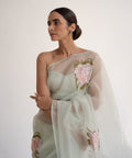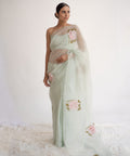 Crafted from pure silk organza, it is designed for an airy drape and delicate fall. The saree comes in a soothing pastel mint shade, adorned with hand-embroidered floral motifs in soft pinks and whites, capturing the essence of serene blossoms in full bloom.