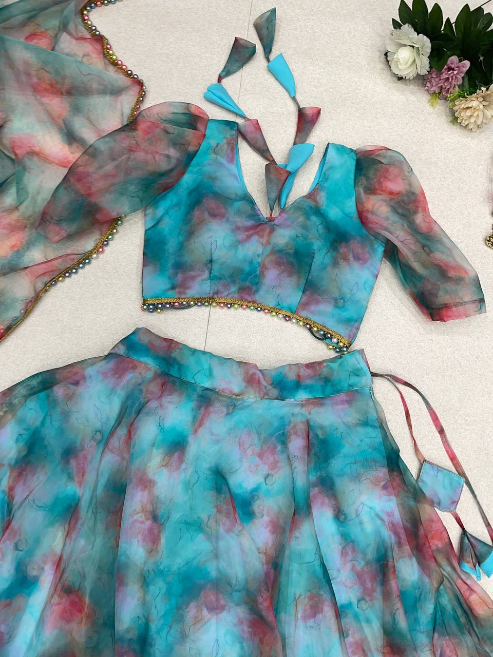 Sky Blue Color Multi Floral Print Organza Lehenga Choli