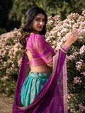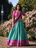 - Kanchipuram zari weaving work sky blue color lehenga choli is a traditional south Indian outfit known for its rich fabric, intricate weaving, and luxurious design.