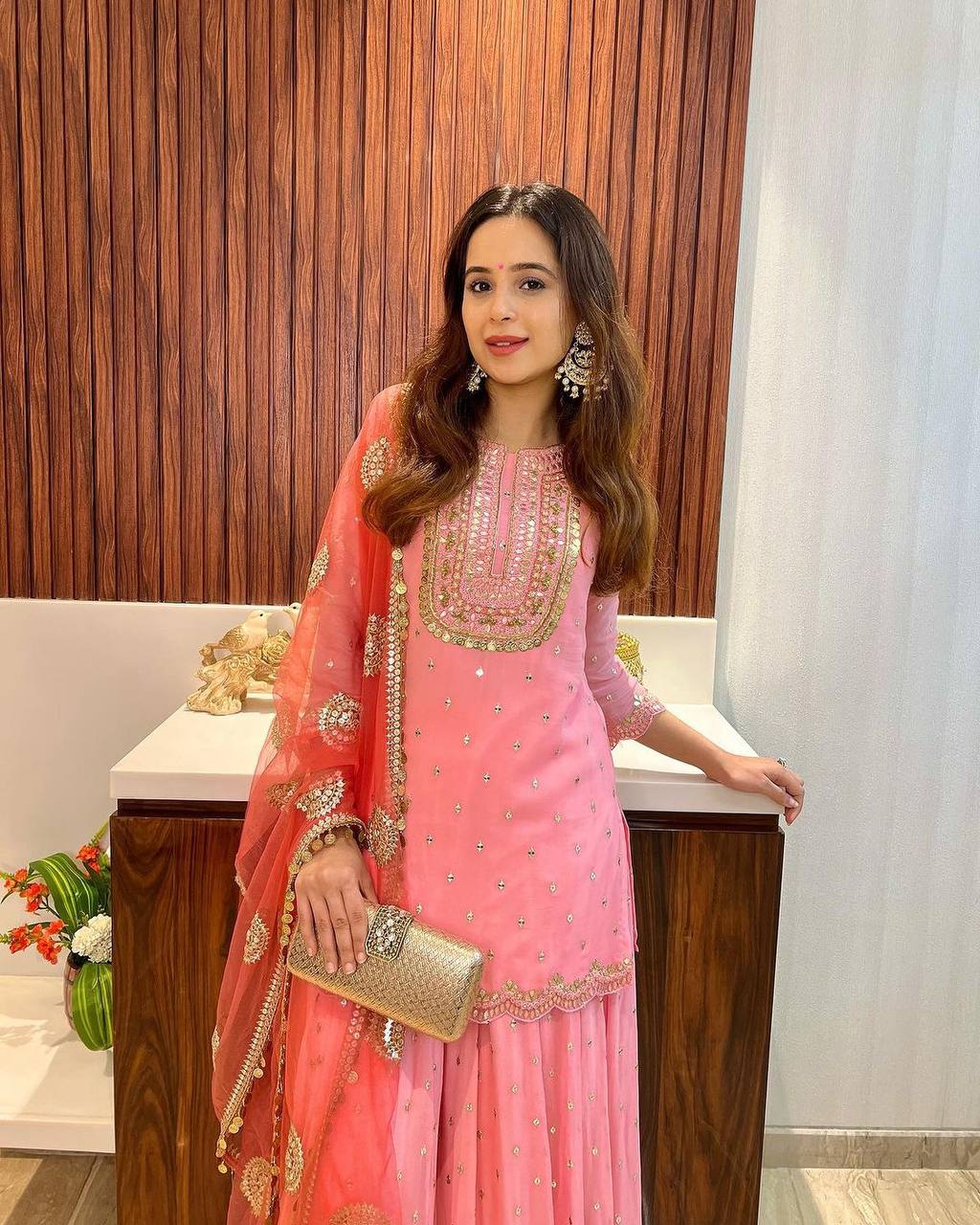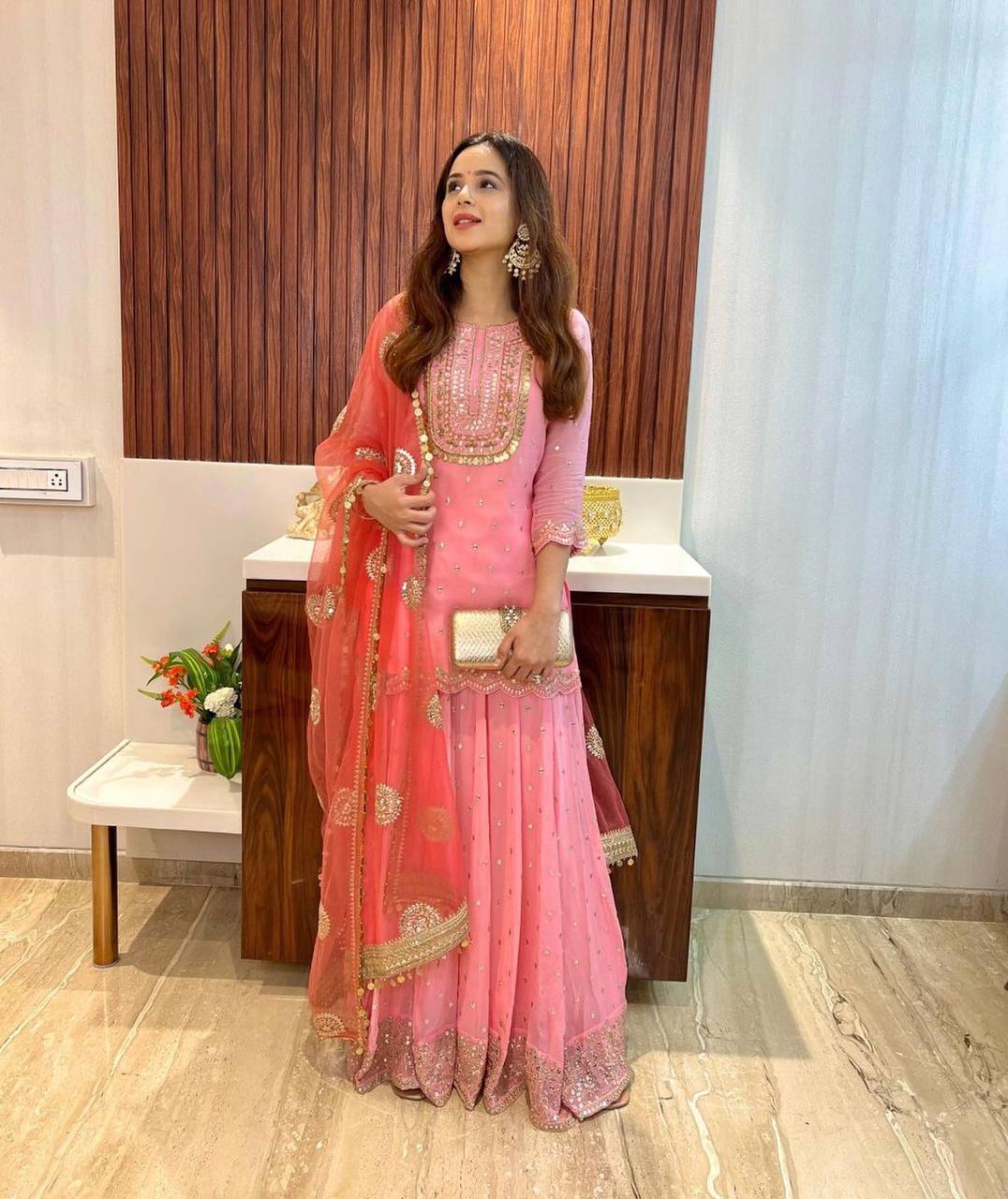 Radiate elegance in our Soft Pink Sharara Set. This enchanting ensemble features a delicately hued sharara bottom paired with a complementing kurta, adorned with subtle detailing. The soft pink tones add a touch of femininity, making it an ideal choice for special occasions or celebrations.