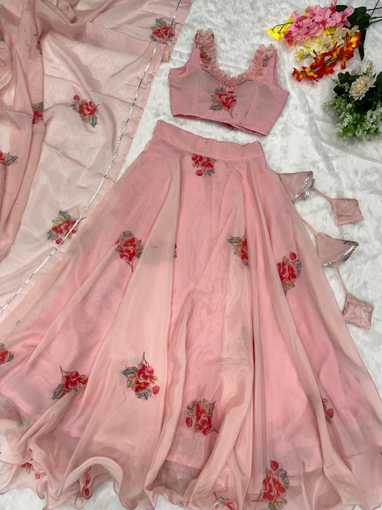 Lehenga Fabric Pure Jimmy Organza Silk Work Digital Printed Type Fully stitched Length 42" Size Up To 44" Size Flair 8 Meter Lehnga With Canvas Patta Choli Fabric Pure Jimmy Organza Silk Type Fully stitched Size Size 38 Padded Blouse (Margin Given) Dupatta Fabric Jimmy Organza Dupatta With Lace Border Type 2 Meter Occasion Party Wear, Ceremony Wear Product Care Instructions Dry Clean Only