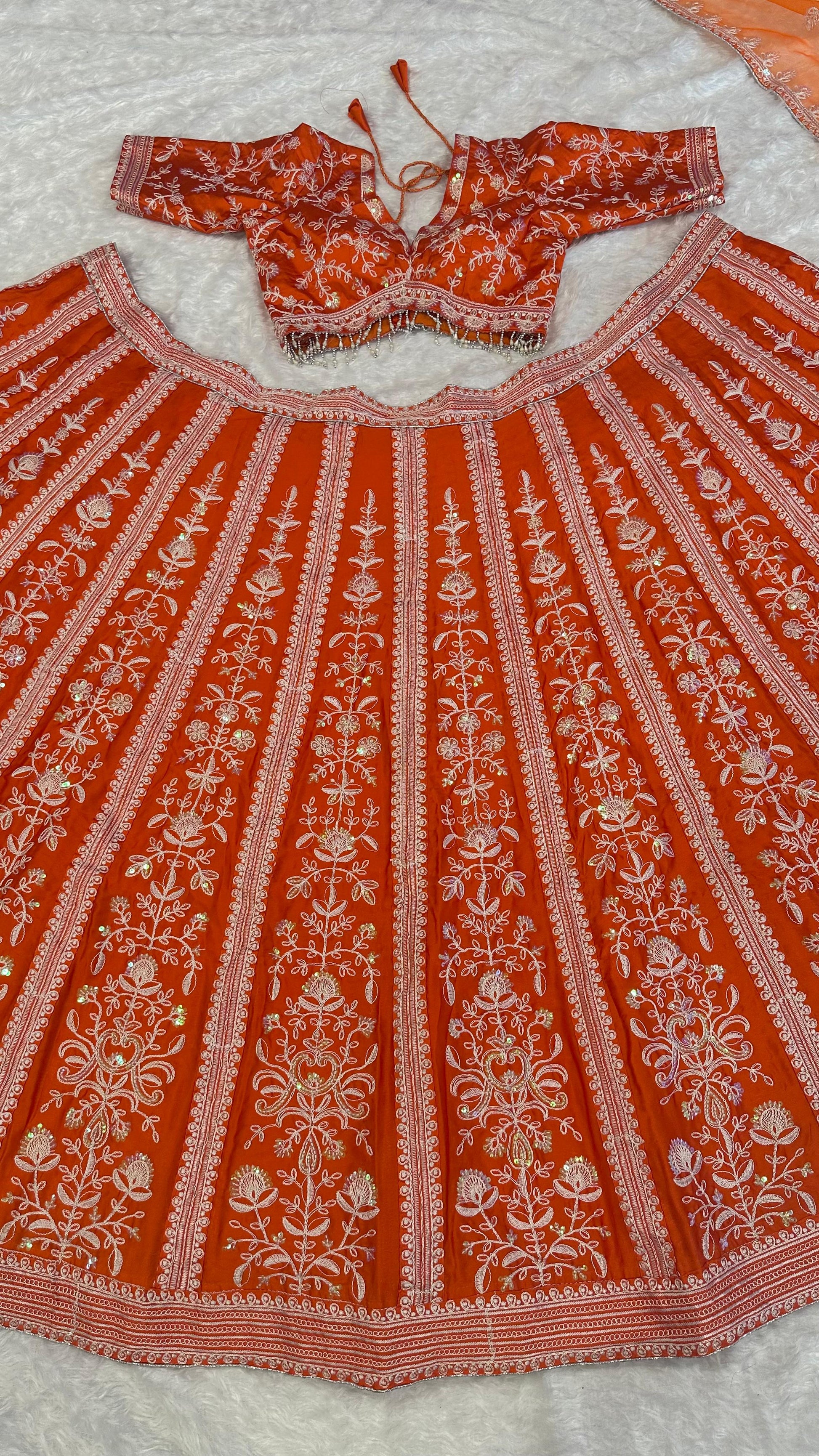 LEHENGA : Mulmul silk lehenga with rainbow sequins & resham thread work.