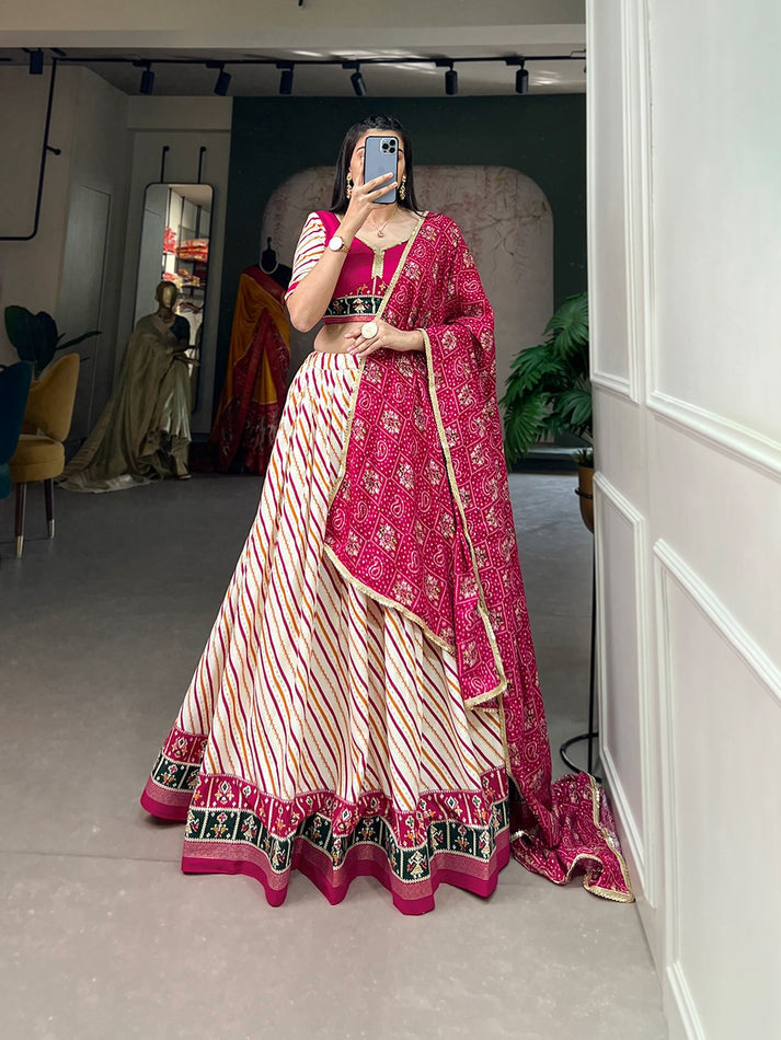 White Leheriya Printed Lehenga With Pink Blouse