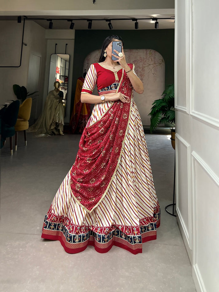 White Leheriya Printed Lehenga With Red Blouse