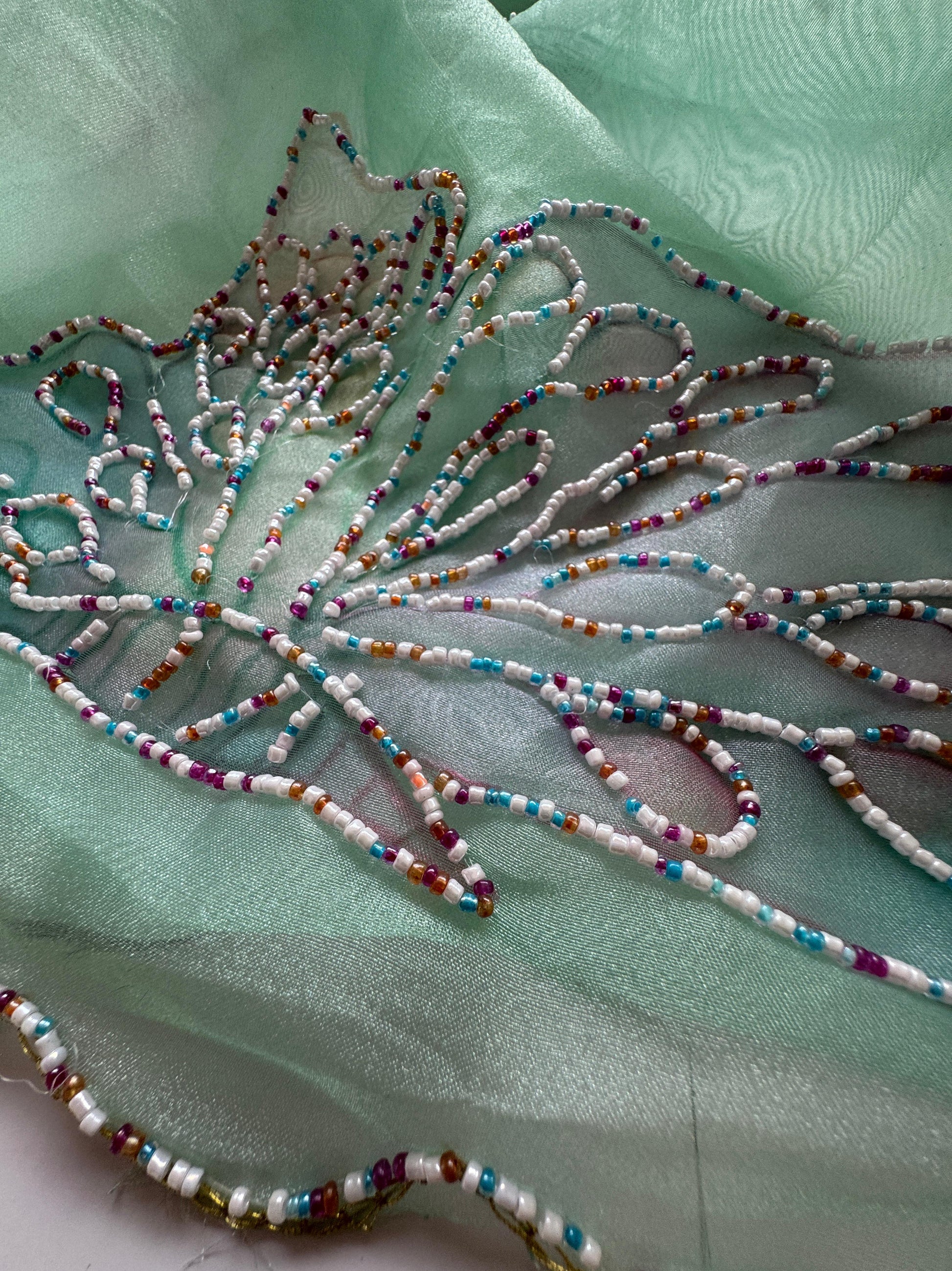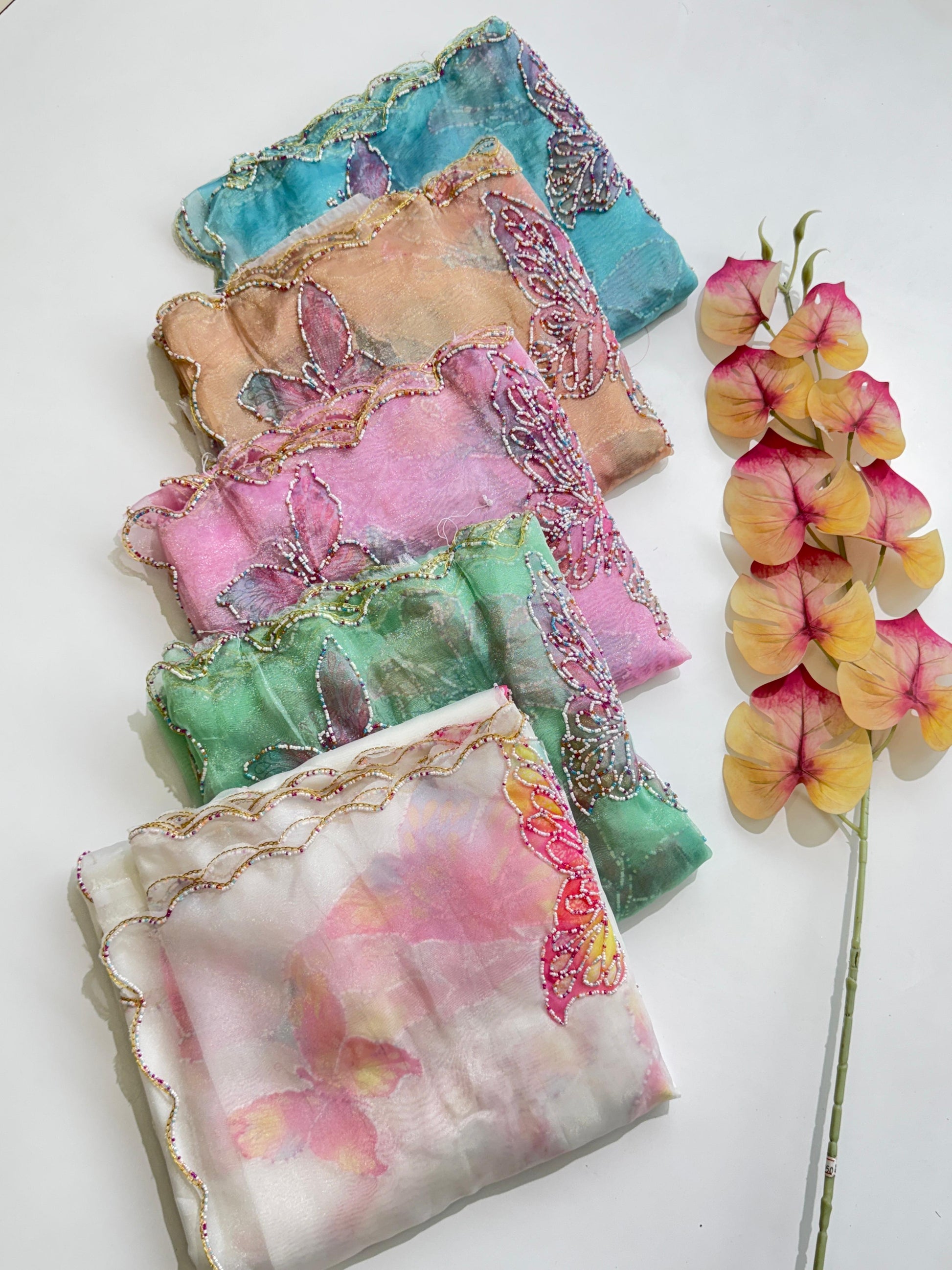 SAREE : Premium Organza Tissue Saree With Digital Printed Butterfly With Pearl Handcraft Work And Pearl Arc Border.