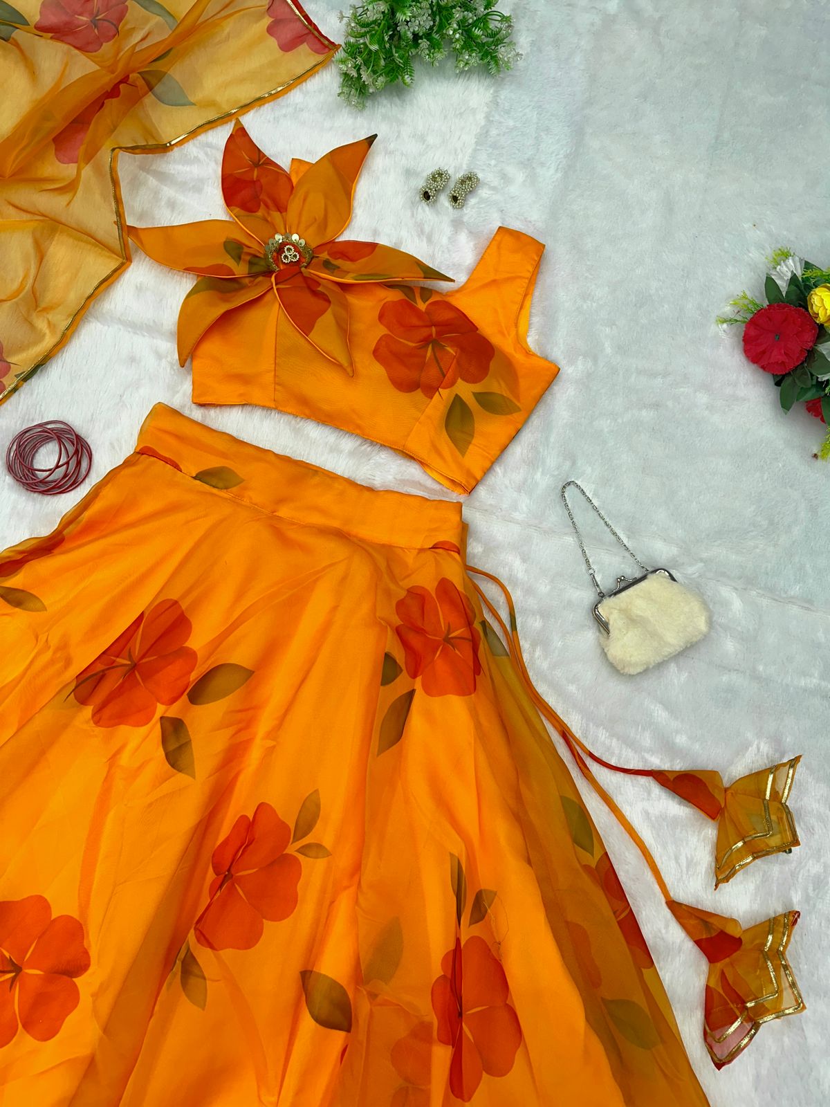 Yellow Color Organza Lehenga With Flower Pattern Blouse
