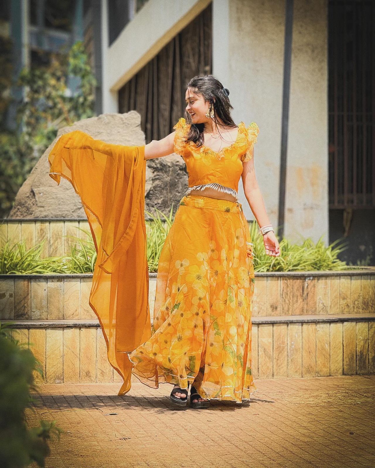 Yellow Organza Silk Flower Printed Lehenga Choli